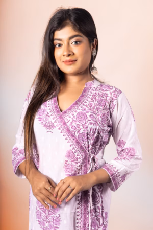 Neckline Detail: Designed with a flattering V-neckline, beautifully accented with subtle white or silver-toned embellishment/embroidery, providing a refined finish.