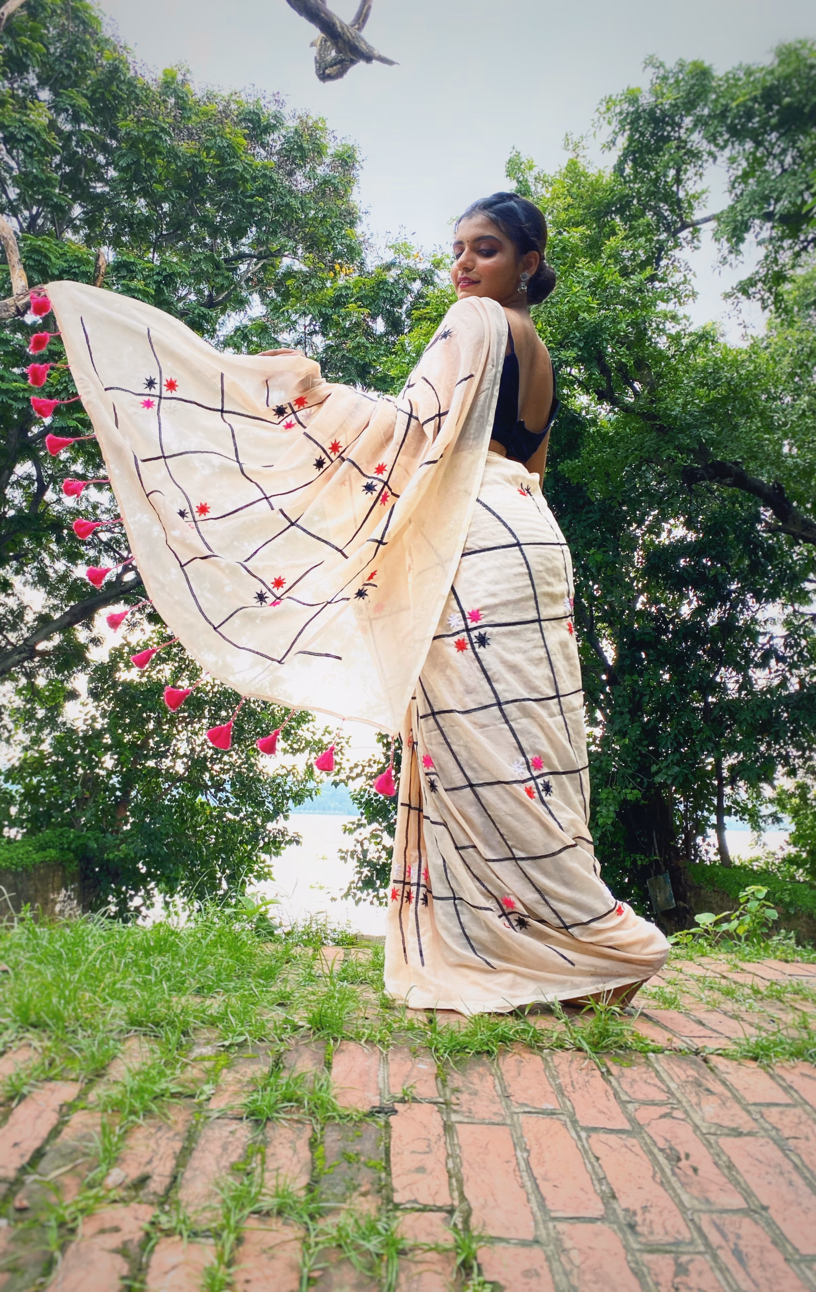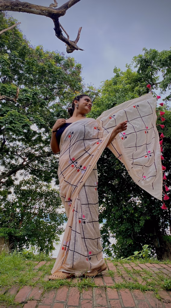 - Name Resonance: The name “Leela” (Sanskrit for “play” or “divine play”) perfectly captures the cheerful and whimsical spirit of this saree. It resonates with the lively pom-poms and delightful motifs, suggesting a garment that is full of joyful spontaneity.