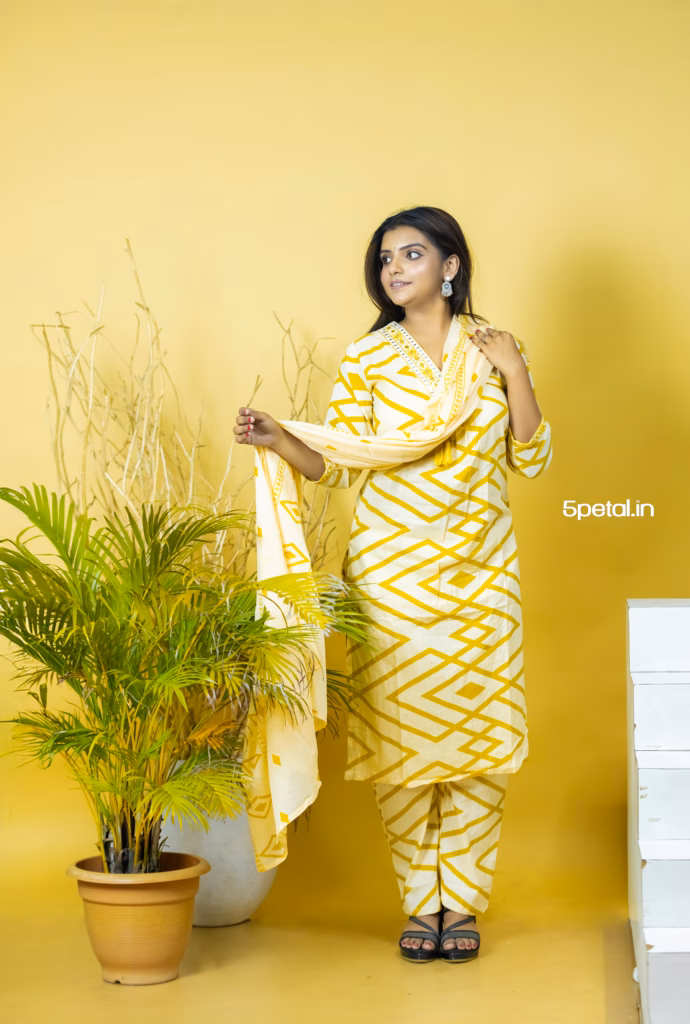The “Primrose” ensemble is characterized by its freshness, vibrancy, and contemporary ethnic style. The playful yet sophisticated geometric print, combined with the bright yellow hue, makes it an ideal choice for daytime events, casual outings, summer gatherings, work-from-home chic, or comfortable travel wear. It’s a perfect blend of traditional silhouette with a modern pattern, designed for effortless elegance.