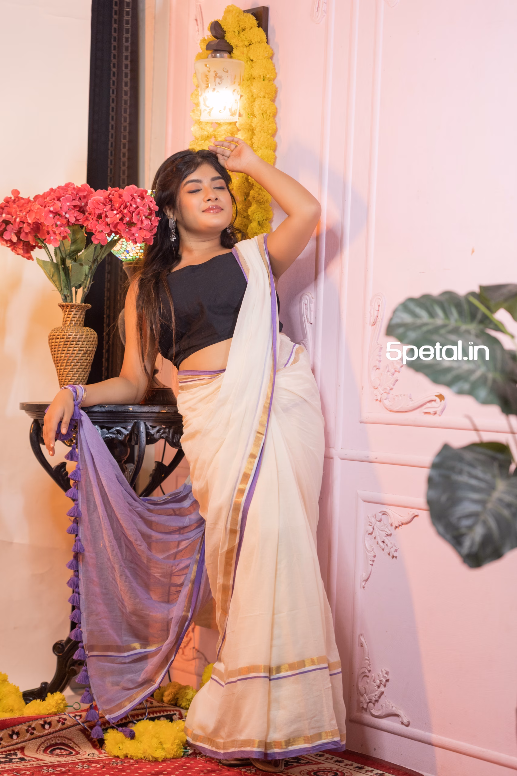 - Pallu Embellishment: Gracefully finished with prominent long blue/purple tassels that adorn the pallu, enhancing its fluid movement and ethereal charm.